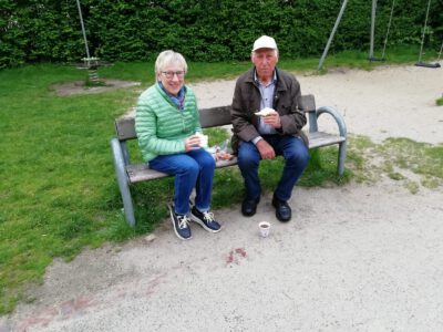 Für manche ging es viel zu schnell wieder auf die Sättel und weiter über Petersfeld, vorbei an Garrel bis nach Amerika, wo wir erneut eine kurze Pause eingelegt haben. Das nächste Ziel unserer Tour waren die Ahlhorner Fischteiche, wo uns bereits unser Verpflegungswagen „Rainer Müller“ mit Kaffee, Tee und Kuchen erwartete. Danach ging es zielstrebig in Richtung Huntlosen.